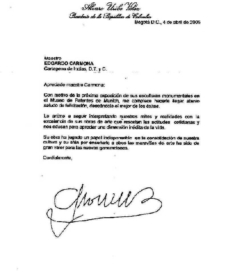 Glückwunsch des kolumbianischen Staatspräsidenten Alvara Uribe Vélez an Edgardo Carmona zur Ausstellung in München